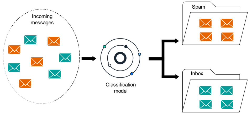 Classification can be utilized in various scenarios, such as spam detection, image recognition, fraud detection, medical diagnosis, among others. For example, the figure below illustrates how a classification model determines whether an incoming message falls under the category of SPAM or Inbox (non-SPAM).
